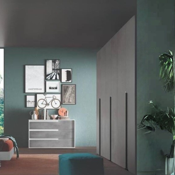 Armadio moderno a tre ante con due cassetti spaziosi. Finitura effetto cemento, misura 135x210H cm. Pratico e capiente, ideale per camere da letto contemporanee.