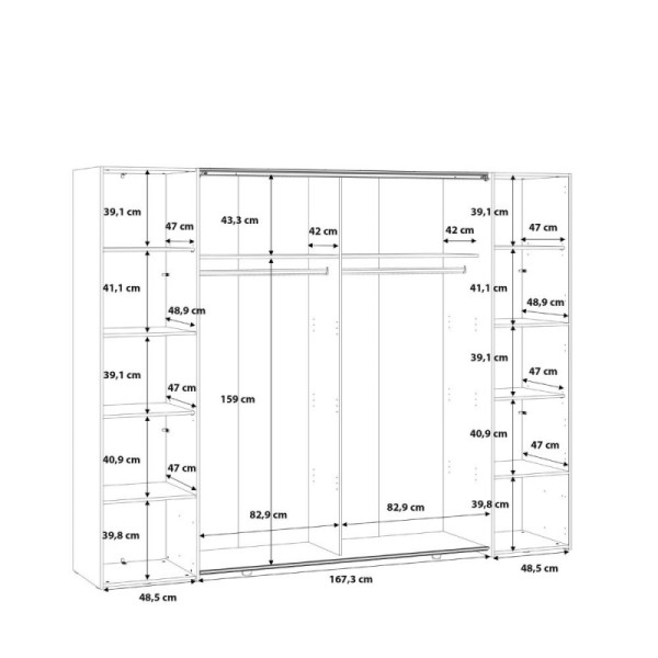 Internamente, l'armadio è organizzato in modo funzionale:10 ripiani spaziosi per riporre maglioni, scatole e biancheria, e 2 robuste aste appendiabiti in grado di sostenere anche i cappotti più pesanti.