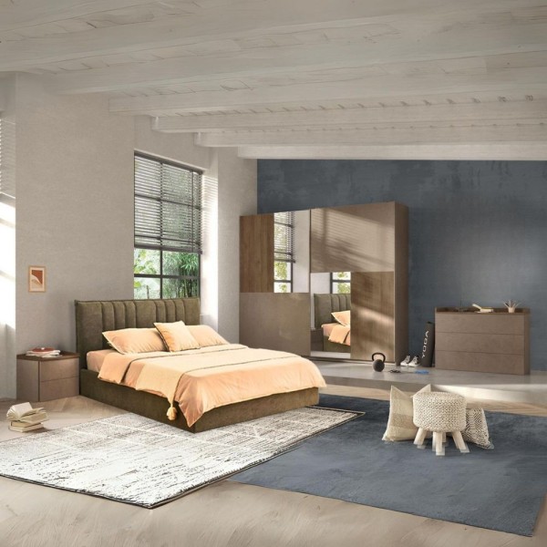 Camera da letto Kendra completa di armadio 2 ante scorrevoli con specchi e letto contenitore. Elegante finitura tortora e noce, ideale per ambienti moderni e funzionali.