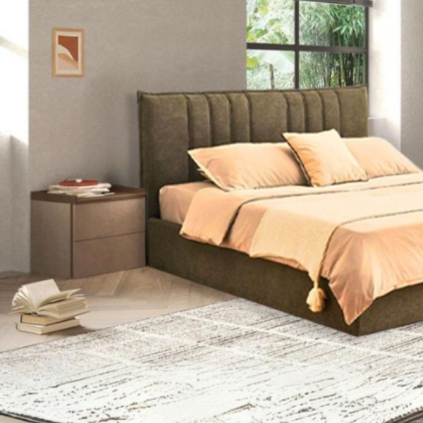 Camera da letto elegante e funzionale, con letto contenitore e finiture color bronzo mercure. Il design moderno e raffinato si adatta a ogni ambiente.