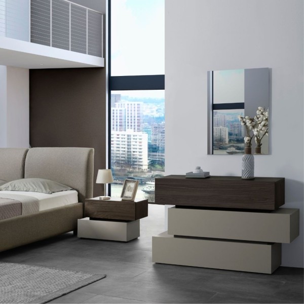 La camera da letto Kendra unisce funzionalità ed eleganza in un unico arredo completo, perfetto per chi desidera uno stile moderno con soluzioni salvaspazio. L’armadio a due ante scorrevoli è dotato di ampi specchi frontali che amplificano la luminosità e la percezione dello spazio, rendendo l’ambiente più accogliente. Il letto matrimoniale con contenitore integrato offre uno spazio aggiuntivo per riporre biancheria e oggetti, mantenendo l’ordine con praticità. Le finiture in tortora e noce conferiscono un tocco di calore e raffinatezza all’intero arredamento. La camera Kendra è la scelta ideale per chi cerca design contemporaneo e comfort, con materiali resistenti e di qualità.