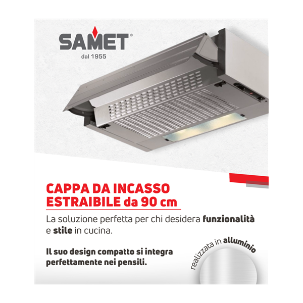 La cappa sottopensile Samet Tornado è un'elegante soluzione per la tua cucina, con un design moderno e funzionale, perfetta per spazi di dimensioni ridotte.
