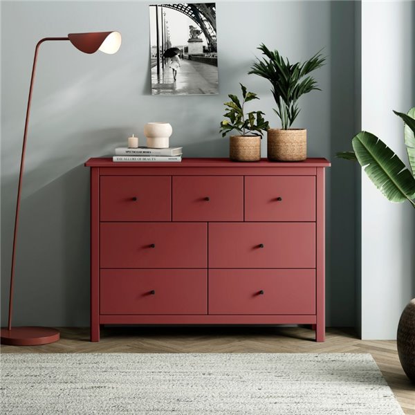 Cassettiera in legno massiccio bordeaux con 7 cassetti spaziosi. Elegante e funzionale, perfetta per arredare con stile camere, ingressi o soggiorni.