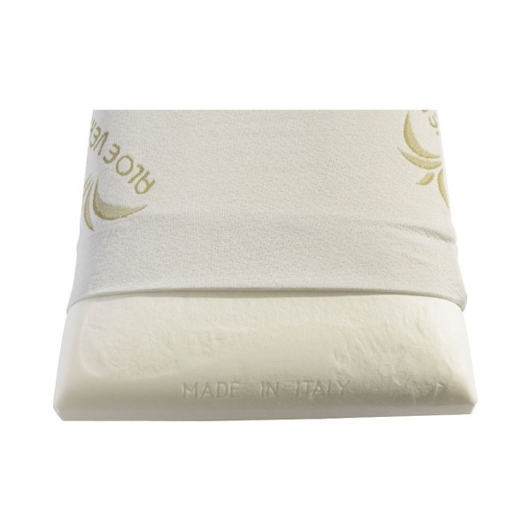 Cuscino ortopedico in memory foam con aloe vera, ideale per un riposo rigenerante. Federa bianca removibile e lavabile. Misure: 72x42x13 cm. Comfort e igiene garantiti.
