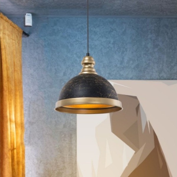 Lampada da soffitto elegante e moderna con paralume in metallo nero e dettagli dorati, perfetta per illuminare con stile qualsiasi ambiente.