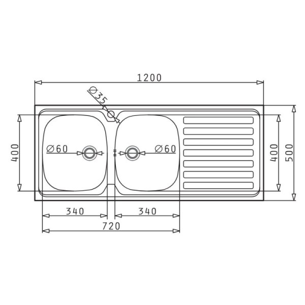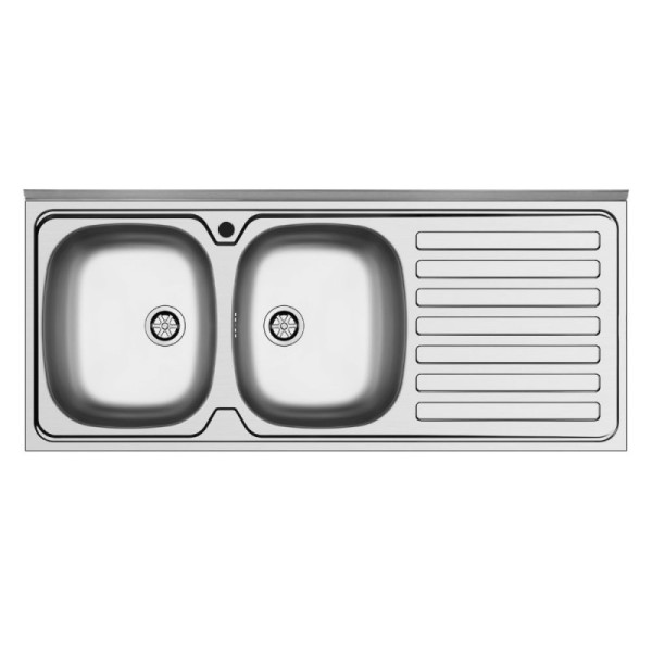 Lavello da appoggio 120x60 cm in acciaio inox con due vasche e gocciolatoio destro. Spazioso, resistente e ideale per cucine grandi e funzionali.