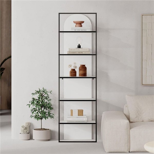 Questa libreria con 5 ripiani è la soluzione ideale per organizzare libri, piante o oggetti decorativi in modo pratico e ordinato. Con un’altezza di 180 cm e una larghezza di soli 53 cm, si adatta perfettamente anche in spazi ristretti. La finitura bianca la rende luminosa e versatile, facilmente abbinabile a diversi stili d’arredo. La struttura in metallo dona stabilità e un tocco industrial leggero, senza appesantire l’ambiente. Perfetta per soggiorni, home office, camere o corridoi, è un arredo funzionale e dal design essenziale.