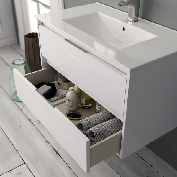 Mobile bagno sospeso da 60 cm, finitura bianco laccato lucido, completo di lavabo in ceramica e 2 cassetti soft-close. Design moderno, ideale per bagni contemporanei.