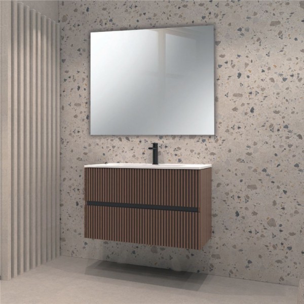 Mobile da bagno sospeso Bifosy in finitura noce effetto cannettato, con due cassetti capienti e specchio incluso. Design moderno, misure 80x45x50H cm.