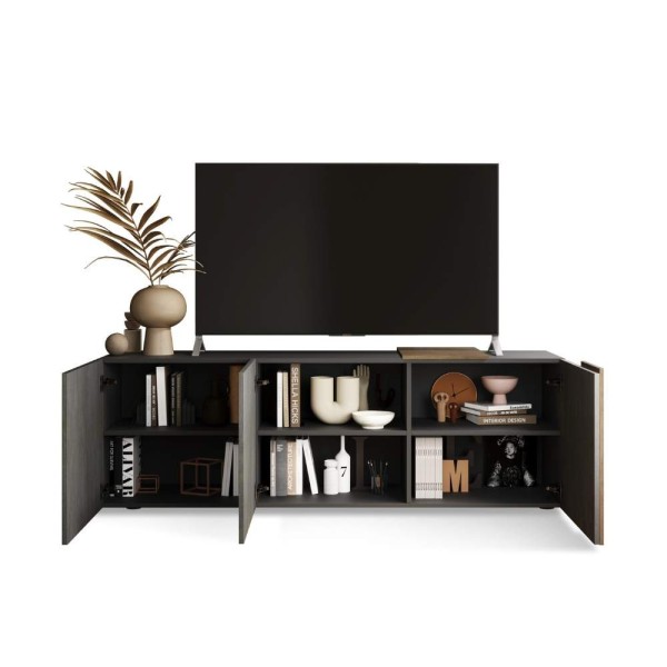Mobile porta TV moderno e funzionale con tre ante, perfetto per organizzare e arredare il tuo spazio multimediale. Colore titanio e rovere mercure.