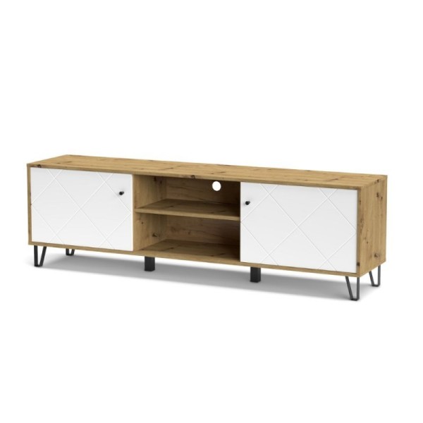 Mobile porta TV con design moderno, 2 ante e vano a giorno per riporre dispositivi multimediali. Colore rovere e bianco, perfetto per arredare il soggiorno.