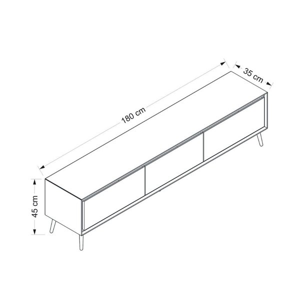 Mobile porta TV dal design moderno con 3 ante, finitura bianca e piedi neri. Elegante e funzionale, ideale per soggiorni contemporanei. Dimensioni: 180x35x45H cm.