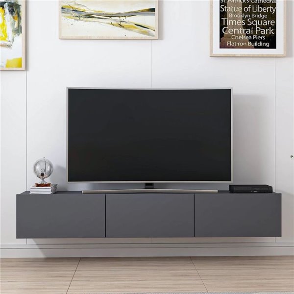 Il mobile porta TV sospeso Nikis è la scelta ideale per chi desidera un arredo funzionale e dal design moderno. Realizzato in resistente pannello melaminico, presenta una finitura antracite opaca che si adatta perfettamente agli ambienti contemporanei. Le due ante offrono uno spazio contenitivo ampio e discreto, perfetto per organizzare dispositivi elettronici, telecomandi e accessori. La struttura sospesa contribuisce a creare un ambiente ordinato e arioso, oltre a facilitare la pulizia del pavimento. Le dimensioni generose di 180x32x30H cm lo rendono adatto a schermi di grandi dimensioni, offrendo al contempo un elegante complemento d’arredo per il soggiorno.