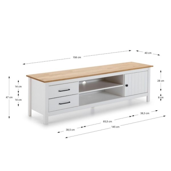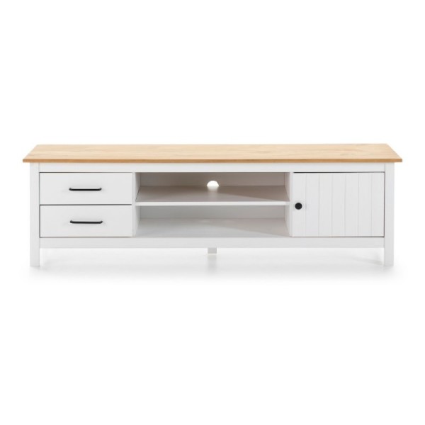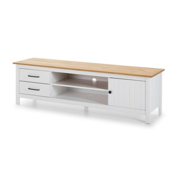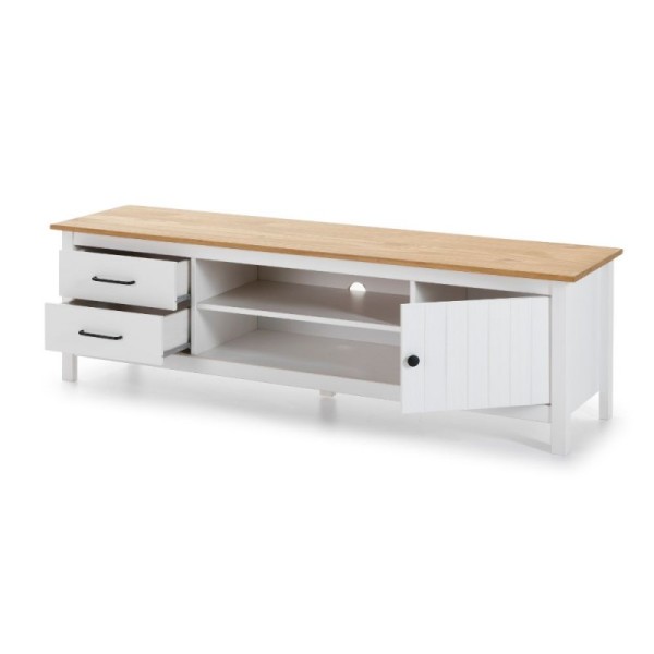 Grazie alla combinazione di 2 vani a giorno, 2 cassetti spaziosi e un'anta laterale, avrai tutto lo spazio necessario per nascondere cavi, telecomandi e collezioni multimediali.