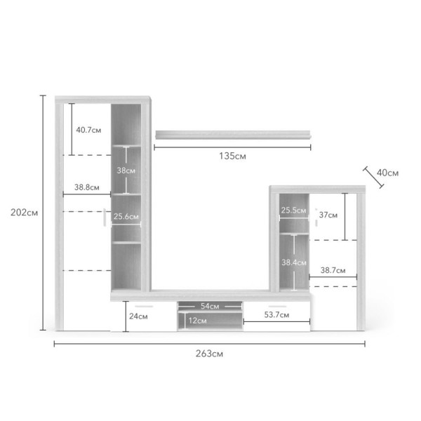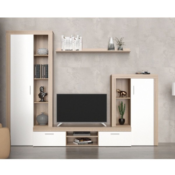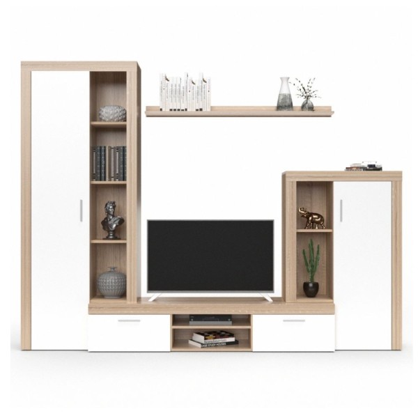 La parete attrezzata 263 cm in legno colore rovere sonoma e bianco - Nobel è un elegante e funzionale complemento d'arredo per il tuo soggiorno. Realizzata con materiali di alta qualità, offre ampio spazio di archiviazione e display per i tuoi oggetti preferiti. Il design moderno e raffinato si adatta perfettamente a qualsiasi stile di arredamento, mentre i colori rovere sonoma e bianco conferiscono un tocco di eleganza e luminosità all'ambiente. Con questa parete attrezzata, potrai organizzare e decorare il tuo soggiorno in modo pratico e esteticamente piacevole.
