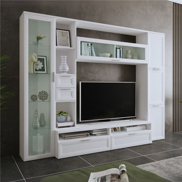La parete attrezzata Larix da 270 cm è una soluzione d’arredo ideale per chi desidera un soggiorno moderno, ordinato e luminoso. Realizzata con finitura bianca, si adatta perfettamente a qualsiasi stile di interni, donando luce e ampiezza agli ambienti. Dotata di vani chiusi con ante e ripiani a giorno, offre ampio spazio per riporre oggetti, libri, dispositivi multimediali e decorazioni. Il design lineare ed essenziale la rende versatile e funzionale, perfetta per organizzare TV, decoder e tutto il necessario in un’unica struttura compatta. Robusta e ben rifinita, Larix unisce praticità ed estetica in un unico arredo contemporaneo.
