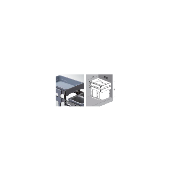 Pattumiera estraibile Tank40 con 2 contenitori grigi e vassoio superiore. Pratica e salvaspazio, perfetta per la raccolta differenziata in cucine moderne.