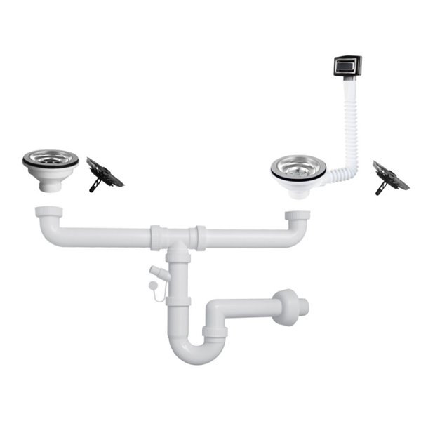 Sifone lavello a 2 vie con attacco 1"1/2, pilettone eco incluso e scarico per lavastoviglie. Ideale per doppio lavello, pratico e facile da installare.