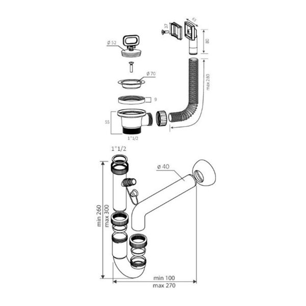 Sifone adatto per lavello in quarzo, 1 via, attacco 1"1/2, con pilettone eco e troppopieno rettangolare. Griglia in acciaio inox. Resistente, durevole ed elegante.