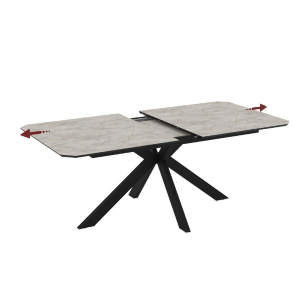 Tavolo allungabile con piano effetto marmo e gambe in metallo.