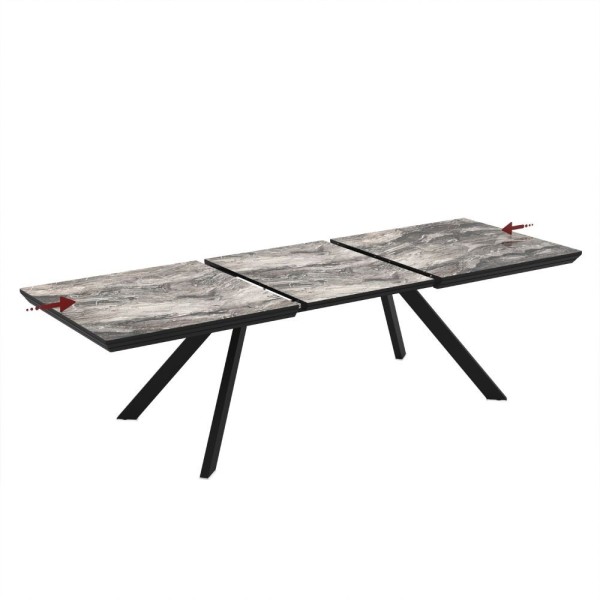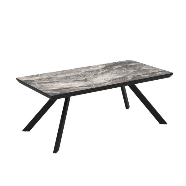 Tavolo fisso elegante con piano in ceramica effetto marmo nero opaco. Misura 160x90 cm, ideale per soggiorni moderni. Struttura robusta e design raffinato per ogni ambiente.