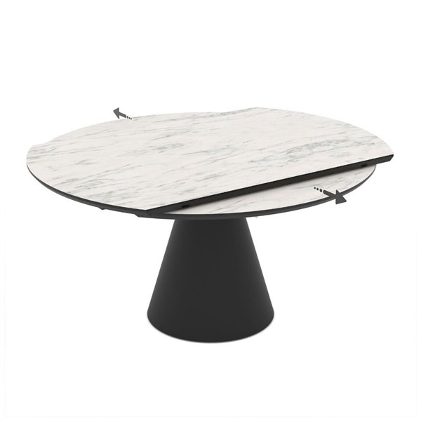 Tavolo girevole e allungabile Yucap con piano effetto marmo bianco opaco e base in metallo nero. Elegante, pratico e ideale per ogni ambiente moderno.