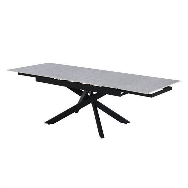 Tavolo allungabile con finitura ceramica larice beige e base in metallo robusto. Funzionale e raffinato, adatto a ogni tipo di ambiente.