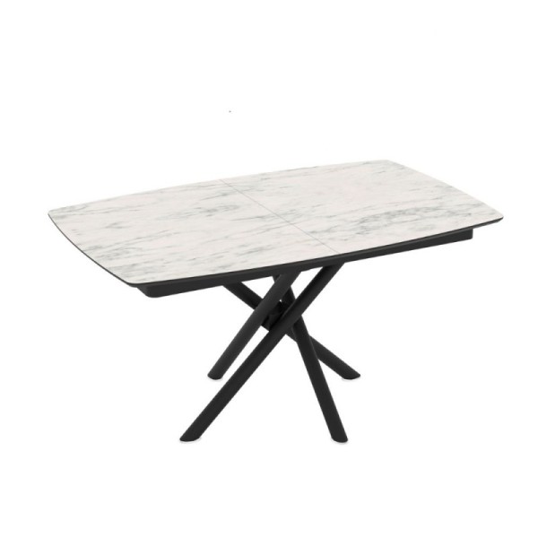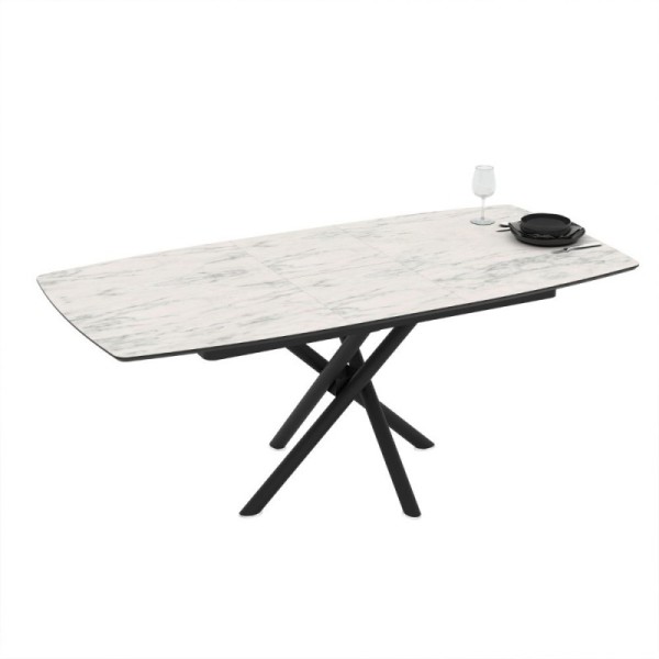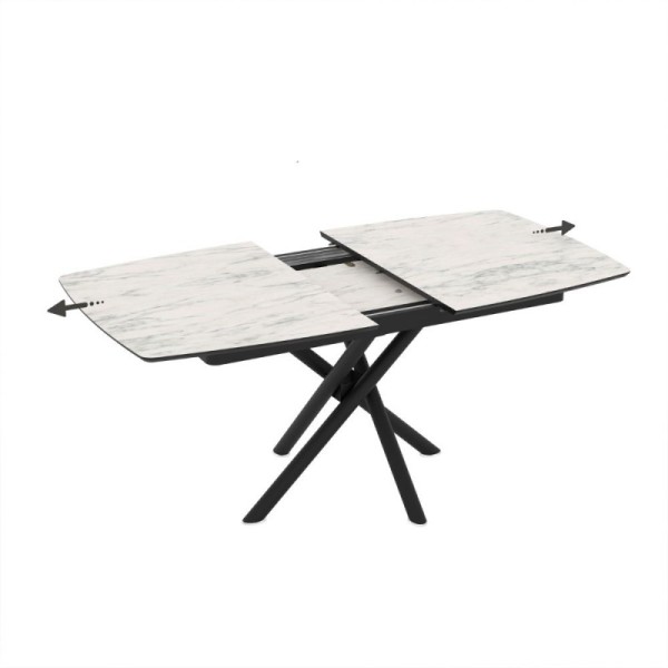 Tavolo allungabile con piano in ceramica e struttura in metallo.