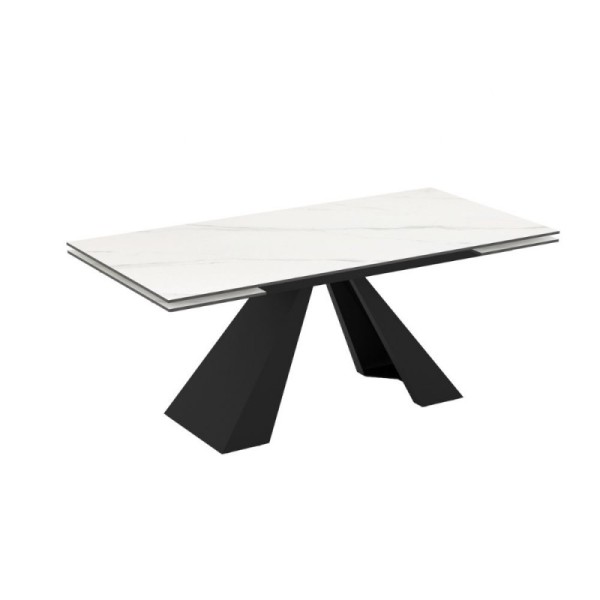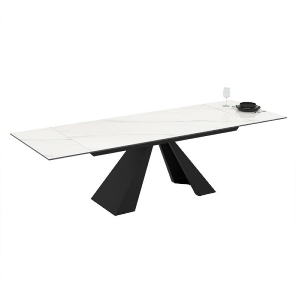 Tavolo allungabile con piano in ceramica e gambe in metallo.