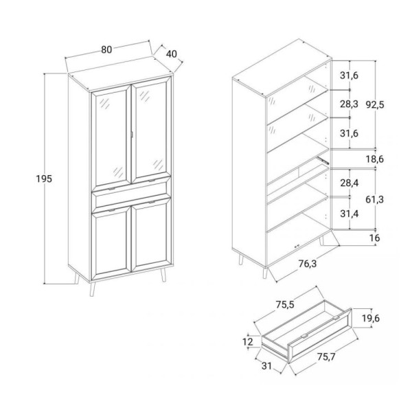 Vetrina elegante e moderna con finiture in pino bianco e rovere, dotata di cassetti e anta per un'organizzazione ottimale degli oggetti. Dimensioni 73x204H cm, perfetta per arredare con stile.